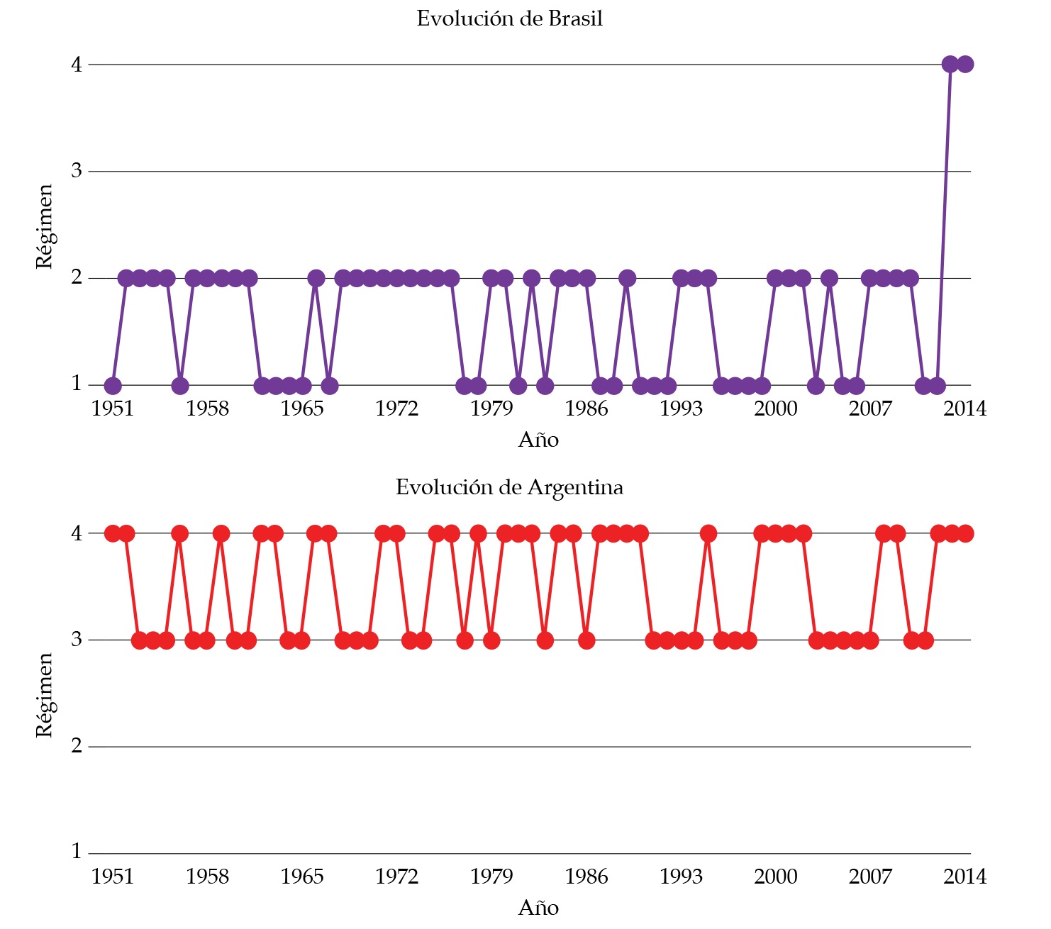 Contando desde la partición del espacio en regímenes, se distinguen dos tipos de dinámicas, una dentro de cada régimen y otra de cambio entre regímenes. La dinámica observada en cada régimen unido al conjunto de la partición elegida es lo que determina un modelo de desempeño que se diferencia de los modelos de los otros conjuntos de la partición. La dinámica de cambio de regímenes puede ser representada de la siguiente manera: a cada país se le asigna un símbolo (1, 2, 3 o 4) en cada momento del tiempo, dependiendo de la región en que esté ubicado.4 Se le asigna un símbolo a cada región (en este caso, la etiqueta elegida es el número de régimen). Así, se transforma la serie temporal bidimensional de crecimiento económico y emisiones de dióxido de carbono (xt, yt) donde t toma los valores enteros comprendidos entre 1951 y el 2014, en la serie temporal simbólica s = {(x1, y1), (x2, y2), …, (xT, yT)} de modo tal que st = j si y solo si (xt, yt) está en el régimen Rj. La serie simbólica s = {(x1, y1), (x2, y2), …, (xT, yT)} contiene toda la información relevante acerca de la dinámica de regímenes poniendo en evidencia distintos tipos de desempeño de los países.