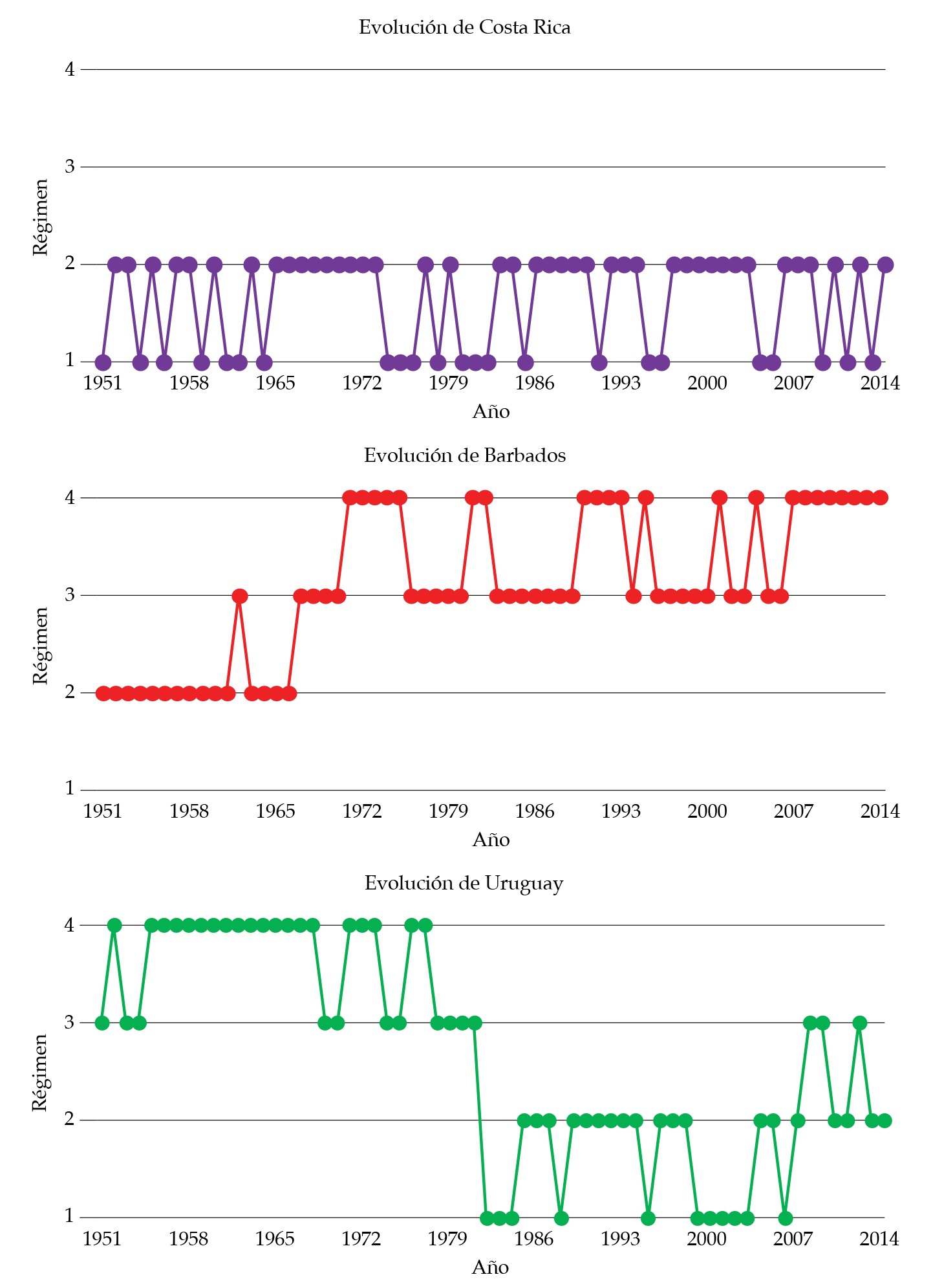 En este caso también se ha de destacar la incidencia que tiene el tamaño de la población, pues en términos agregados, Argentina tiene emisiones considerablemente mayores que Barbados. Es interesante el comportamiento que exhibe Barbados, ubicándose al inicio del periodo y durante 15 años aproximadamente en el régimen 2, y luego pasa a ubicarse en los regímenes 3 y 4 durante lo que resta del periodo, es decir, que inicia con bajas emisiones (y alta tasa de crecimiento económico) y hacia el final de los años 60 comienza a posicionarse en los regímenes de alta emisión de co2. Además, es interesante el comportamiento que tienen Uruguay y Panamá, que no presentan el mismo comportamiento de los otros países. Se puede observar que ambos recorren todos los regímenes y por tanto a lo largo del periodo han tenido grandes fluctuaciones en cuanto a emisiones y crecimiento. Una primera aproximación interpretativa podría ser la idea de que ambos países —aún con dinámicas poco estables entre regímenes—, durante el periodo parecen permanecer mayor tiempo en un contexto de bajas emisiones de dióxido de carbono.