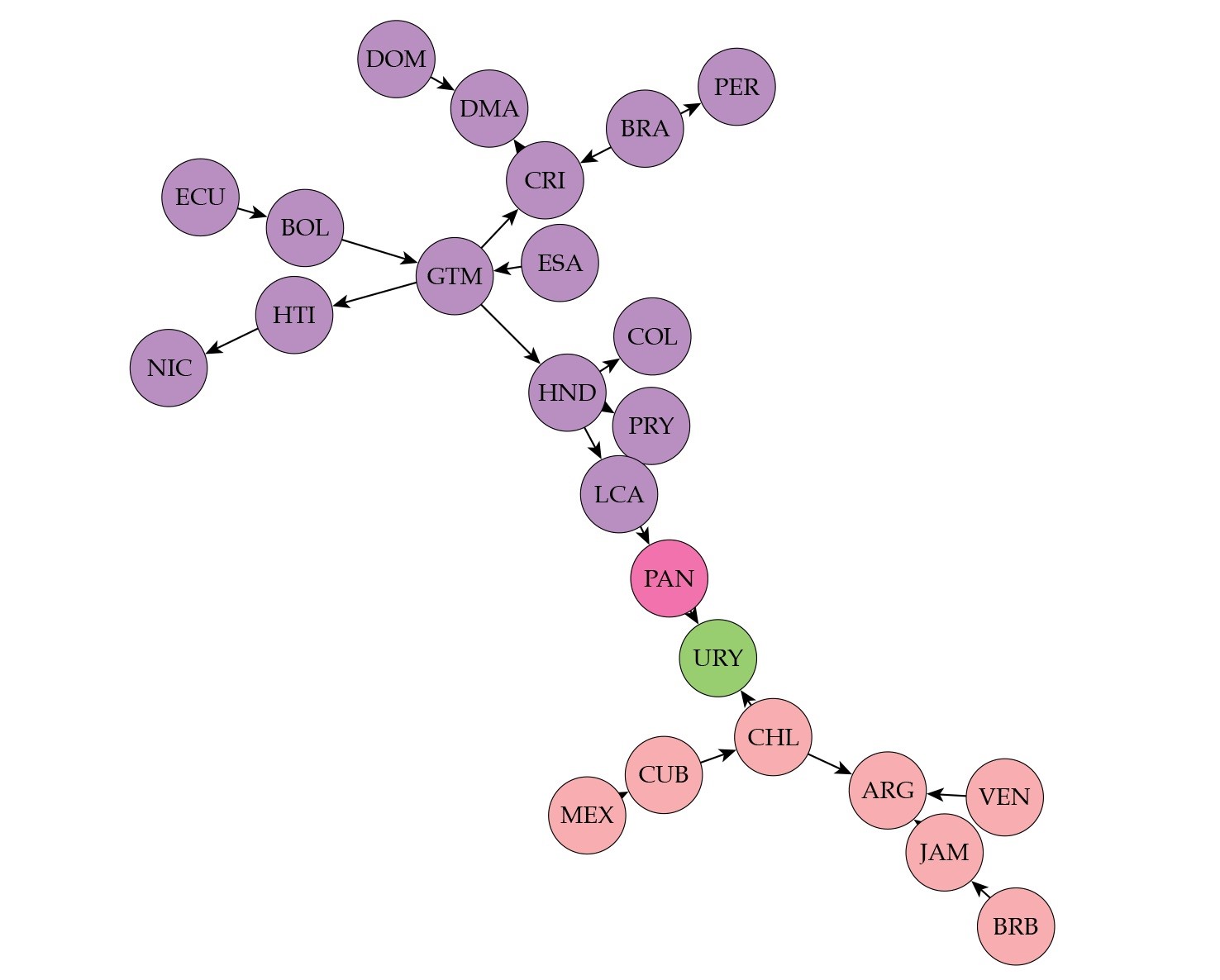 En la figura 4 se observa el Árbol de Expansión Mínima (mst por sus siglas en inglés, Minimum Spanning Tree), el cual se construye a partir del algoritmo de Kruskal (1956). Partiendo del mst se pueden analizar algunos rasgos característicos que influyen sobre el comportamiento de los países.