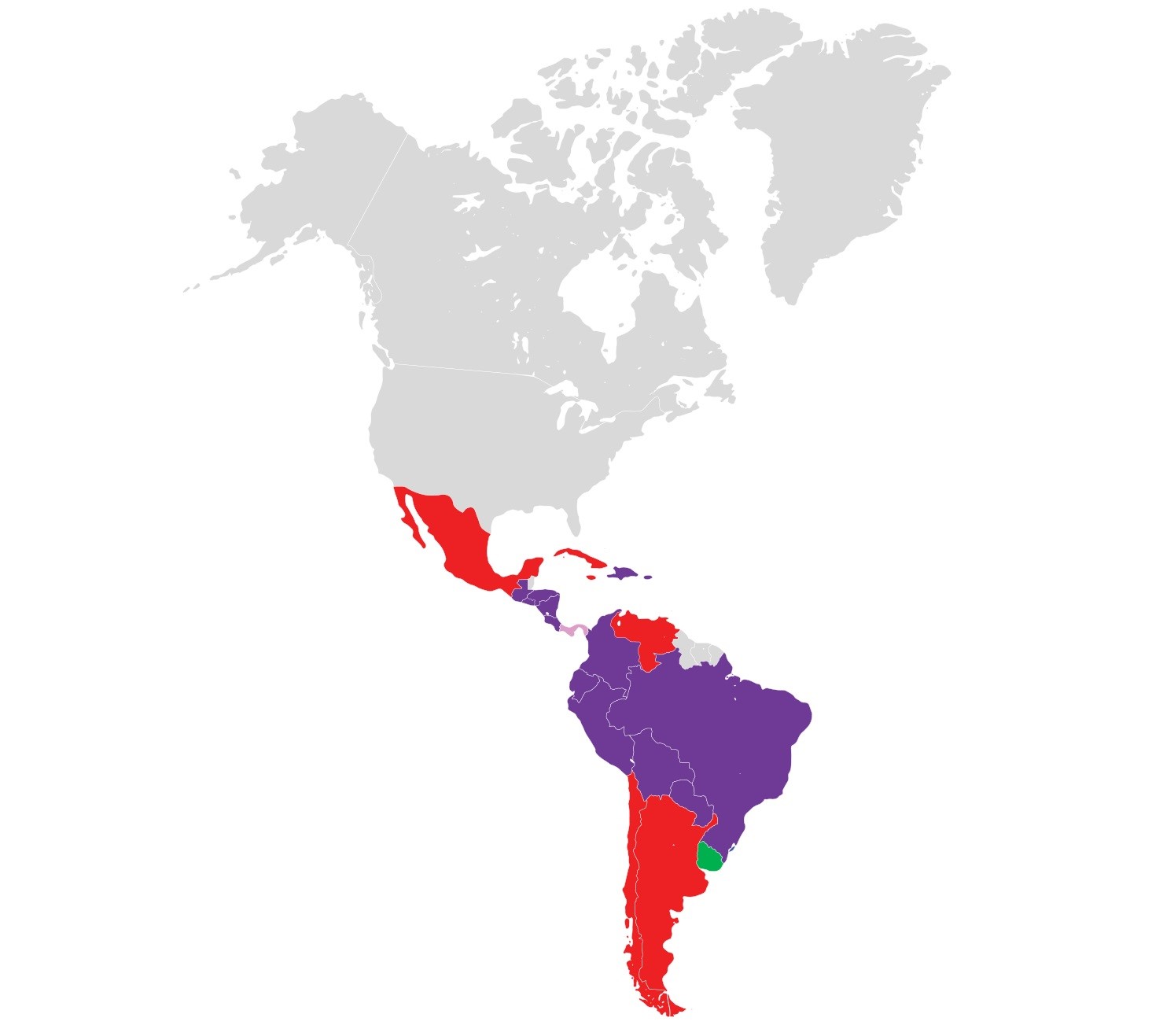 Nota: Rojo: Grupo 1 (altas emisiones); Violeta: Grupo 2 (bajas emisiones), Verde: Uruguay; Rosado: Panamá; Gris: países que no integran la muestra.