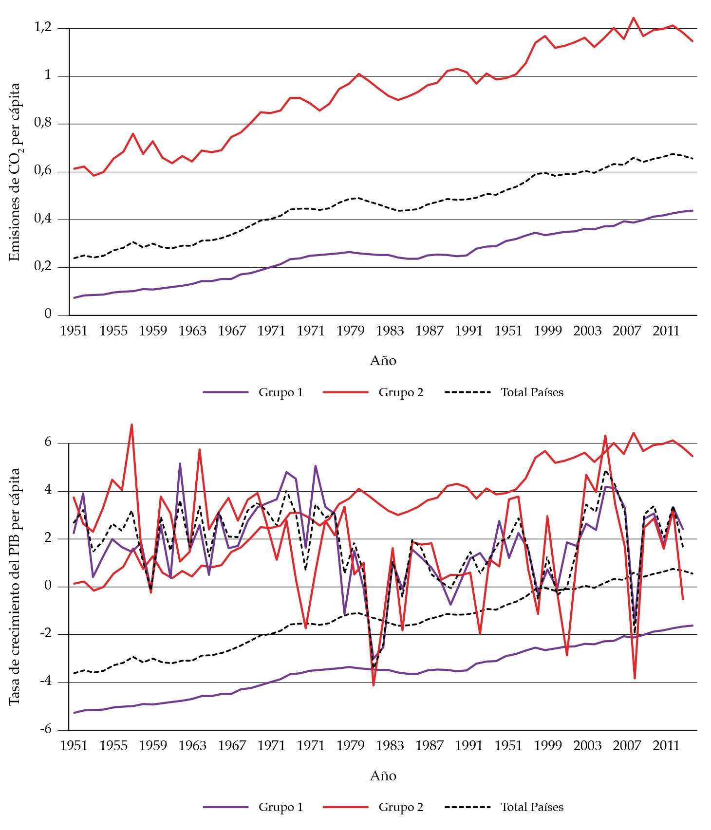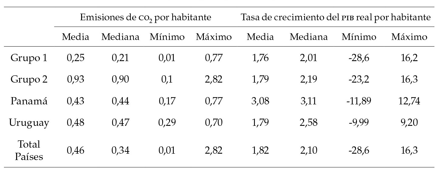 Así, la serie promedio de emisiones alcanza su media en el periodo en 0.93 toneladas métricas por habitante. Esta serie se caracteriza por ser más volátil en el tiempo, en torno a una tendencia respecto a la descrita anteriormente, así mismo, de acuerdo a la serie promedio considerando a todo el panel de países, e incluso, su tendencia creciente es más acentuada que la del grupo 1 (véase tabla A2 y figura A2 en el Apéndice). Por último, en lo que respecta al crecimiento económico no se observa que un grupo se encuentre sistemáticamente con mejor rendimiento que otro, sin embargo, el crecimiento promedio para todo el periodo considerado es menor en el grupo 1. Los casos de Panamá y Uruguay se pueden considerar como outliers debido a que no se corresponden en su comportamiento dinámico conjunto con ninguno de los dos grupos antes descritos. Ambos países tienen un nivel de emisiones de co2 per cápita promedio y un rango en sus niveles que no se corresponde a los esquemas plasmados en los dos grupos conformados por el resto de los países.