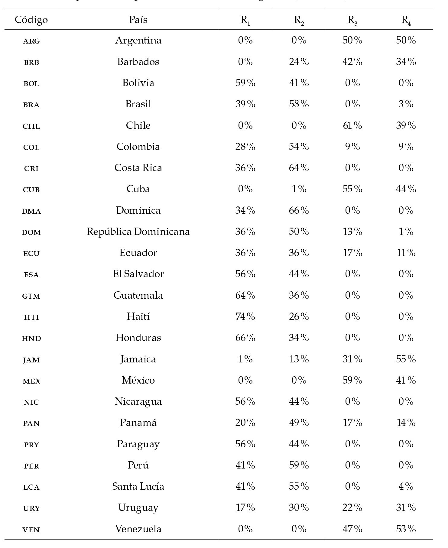 Se pueden observar países donde la permanencia estuvo dada casi siempre en regímenes con bajos niveles de emisiones per cápita, y en oposición, otros casos donde la permanencia estuvo dada en niveles de altas emisiones. Sin embargo, ciertos casos muestran que la permanencia es alternada entre los cuatro distintos regímenes como comportamientos dinámicos disímiles a lo largo del periodo, pero donde existe cierta predominancia en la permanencia en un régimen determinado (véase tabla A1 en el Apéndice).