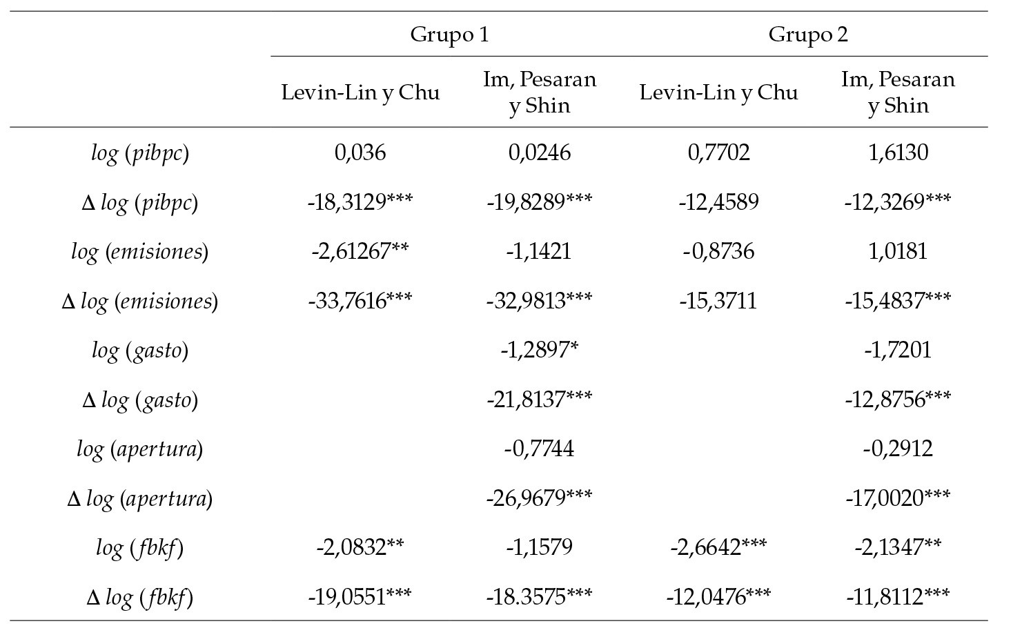 Previo al análisis cuantitativo de los países de América Latina y el Caribe para la verificación de la ekc, es necesario precisar el orden de integración asociado a los procesos de cada uno de los indicadores considerados para dar validez a las potenciales relaciones causales encontradas y no caer en el análisis que sean espurias. Para ello, se emplearán dos test de raíces unitarias para paneles. La prueba de raíz unitaria para paneles de Levin-Lin y Chu (2002) se caracteriza por plantar una hipótesis nula de la existencia de al menos una raíz unitaria en el proceso analizado contra una hipótesis alternativa de paneles estacionarios. La característica central de esta prueba es que considera que el modelo subyacente del cual proviene el test es común entre todas las unidades del panel, tal como se puede observar en la especificación teórica de la ecuación (1).