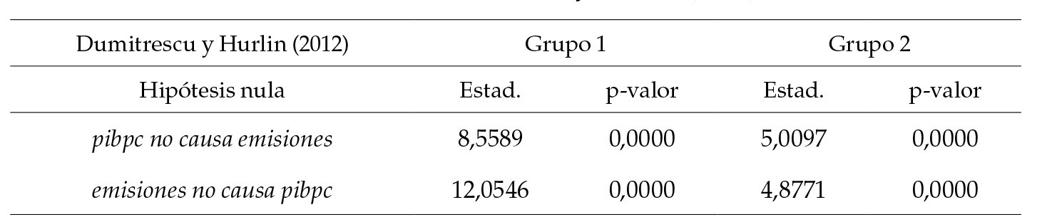 Al aplicar este test a ambos grupos, se encuentra que para todo el periodo considerado existe una relación causal, al menos en el corto plazo en ambos sentidos entre el pib real por habitante y las emisiones de co2 per cápita (se trabaja con las primeras diferencias, pues estas son estacionarias tal como requiere la prueba. En el apéndice se puede encontrar mayor información sobre las pruebas de raíz unitaria empleadas). A partir de estos resultados, sería relevante testear la existencia de relaciones de largo plazo entre estas variables y medir la magnitud de estas relaciones causales, en particular, para verificar la existencia de la ekc en América Latina y el Caribe.