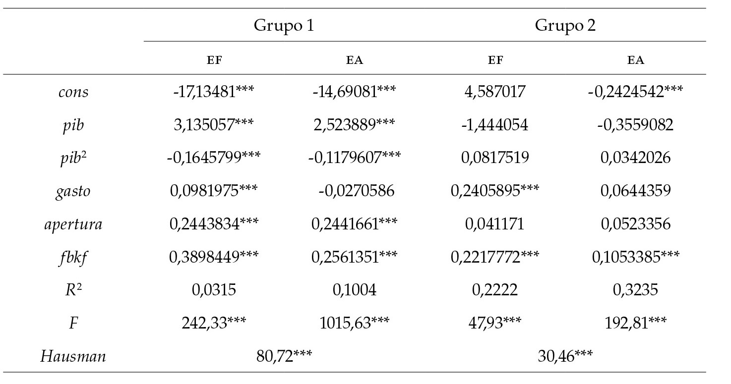 Este último sugiere cuál de las dos estimaciones es consistente y eficiente donde la hipótesis nula sugiere que el estimado por ef es consistente, pero ea es consistente y eficiente. Su hipótesis alternativa sugiere que ef es consistente, pero ea es inconsistente. A partir de los resultados obtenidos, se observa que en la mayoría de los casos los coeficientes estimados son significativos. Sin embargo, solo se logra verificar la ekc el grupo de bajas emisiones, ya sea que se estime mediante ef o ea. El testeo mediante Hausman da evidencia a favor de un estimador por ef consistente.