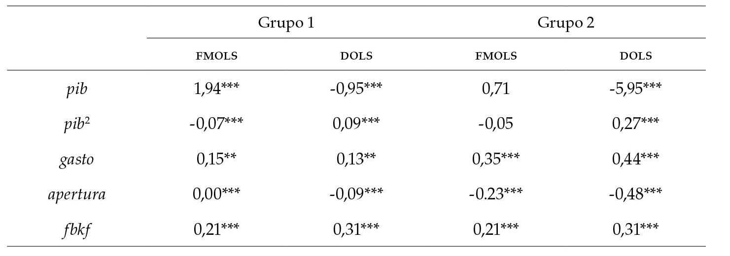 La tabla 5 muestra los resultados de los coeficientes estimados para fmols y dols. Según las estimaciones fmols, en el grupo 1 se verifica la ekc, encontrando que todos los coeficientes son significativos y con los signos esperados, en cambio en el grupo 2, si bien se obtienen los signos esperados según la hipótesis de la ekc, los coeficientes no resultan estadísticamente significativos. Para el caso de las estimaciones por el método dols, si bien también se obtienen coeficientes significativos, estos no tienen los signos esperados en ninguno de los dos grupos, no verificando la ekc. Se observa un efecto negativo del crecimiento económico en las emisiones de co2, mientras que la variable al cuadrado tendría efecto positivo.