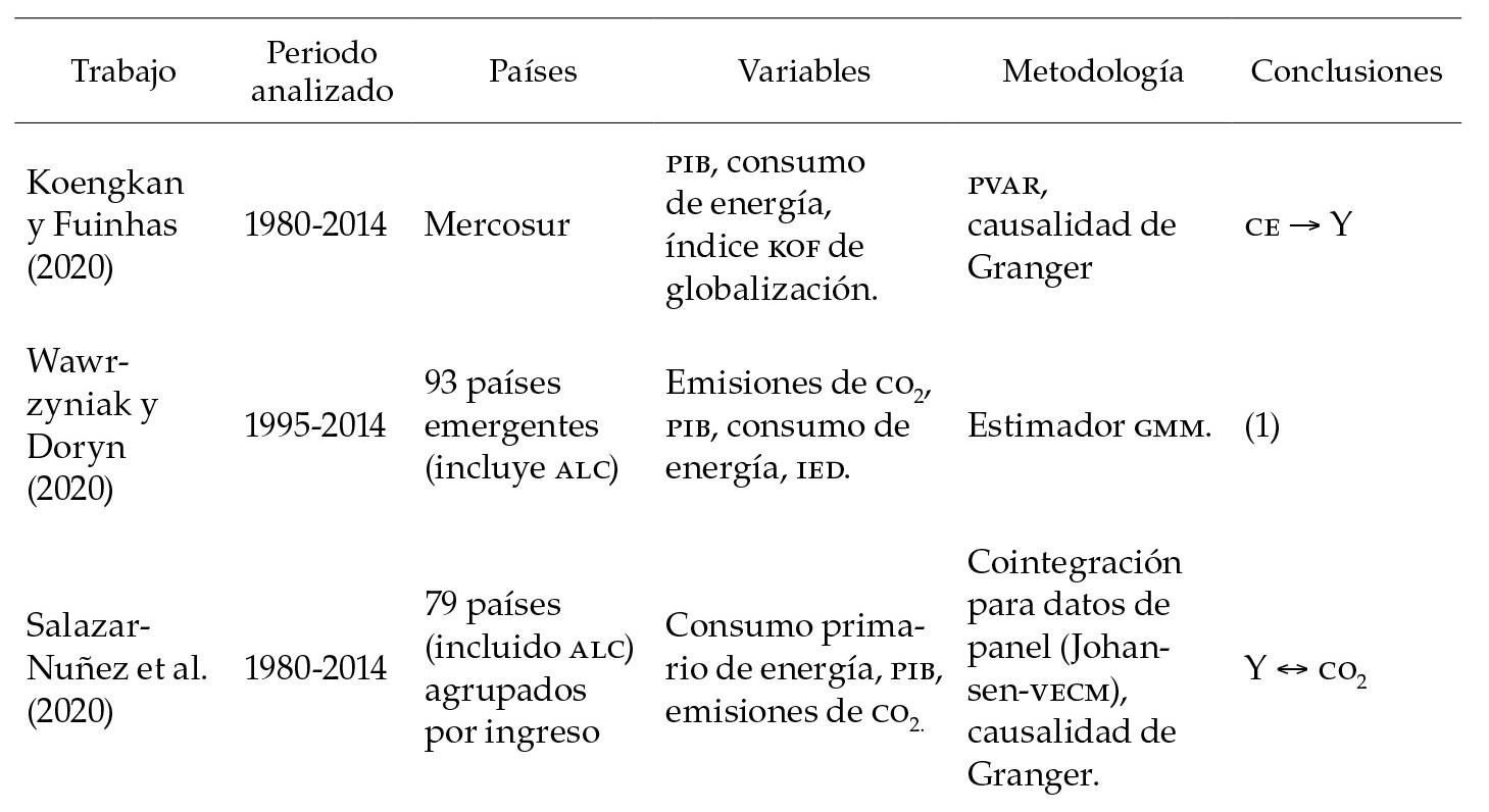 Los estudios para América Latina y el Caribe son numerosos. Muchas investigaciones analizan la relación existente entre el crecimiento económico y el consumo de energía (Antonakakis et al., 2017; Koengkan & Fuinhas, 2020; Rodríguez-Caballero & Ventosa-Santaularia, 2017; Nguyen & Kakinaka, 2018; Ben Mbarek et al., 2018) donde se encuentran resultados en diversos sentidos, tanto una relación causal desde el consumo de energía hacia el crecimiento y, desde el crecimiento al consumo energético, así como también en ambas direcciones. Un punto en común es la metodología, en la cual los vectores autorregresivos para paneles, los modelos vectoriales de corrección del error y la causalidad de Granger fueron las principales vías para la obtención de resultados.