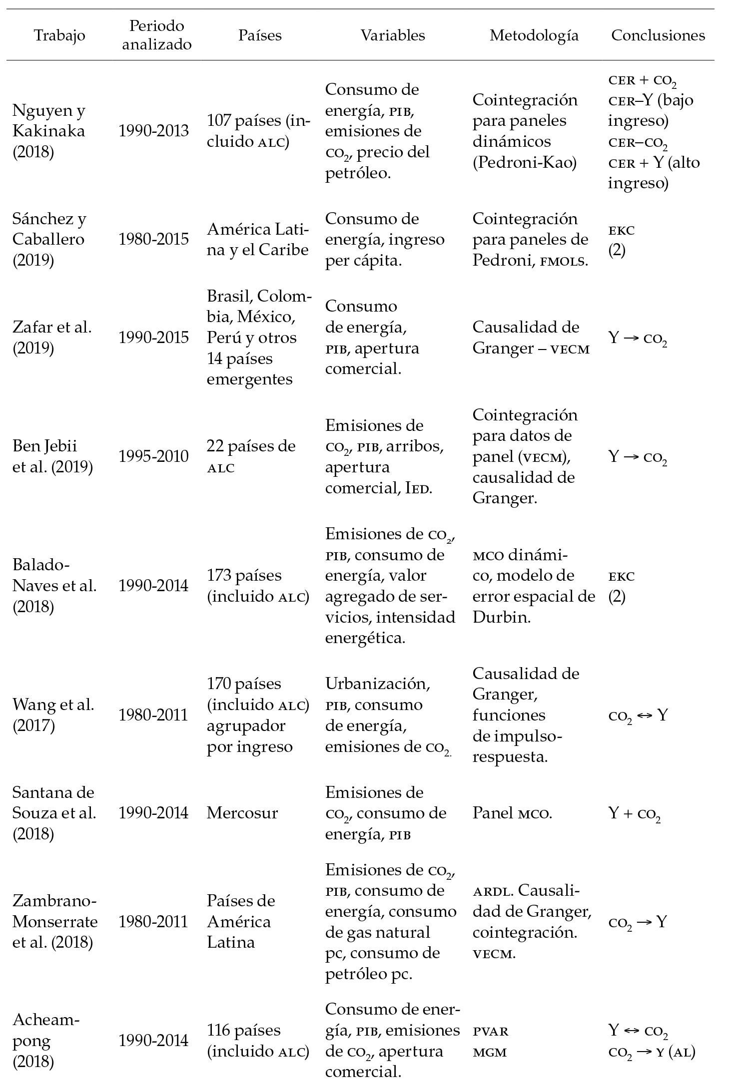 Son diversos los antecedentes relevantes para la región, en cuanto al estudio del medio ambiente determinado a partir de las emisiones de dióxido de carbono, conjuntamente con el crecimiento económico. En esta línea, distintos estudios encuentran una relación causal en ambos sentidos entre el crecimiento económico y las emisiones de co2, tanto en estudios de caso como para paneles de países (Salazar-Nuñez et al., 2020; Ben Jelbi et al., 2019; Balado-Naves et al., 2018; Apergis & Payne, 2015, 2014, 2009; Al Mulali et al., 2015; Pao & Tsai, 2011). Sin embargo, otros autores se contraponen a estas ideas y plantean que la relación causal entre las dos variables es unívoca, por un lado, desde las emisiones de co2 hacia el crecimiento económico (Agbanike et al., 2019; Zambrano-Monserrate et al., 2018 ) y por otro lado, desde el crecimiento de las economías hacia las emisiones de dióxido de carbono (Al Mulali, 2014; Gómez & Rodríguez, 2016; Dutta & Das, 2016; Ozturk, 2017; Ben Jelbi et al., 2019; Zafar et al., 2019; Patiño et al., 2019). En estos casos, nuevamente las metodologías implementadas siguen una línea común. Entre los principales métodos se destacan el procedimiento de cointegración de Johansen (vecm) y test de causalidad en el sentido de Granger. Sin embargo, adicionalmente se encuentran estudios que optan por la utilización del método de mínimos cuadrados dinámicos (dols) o por la utilización de modelos autorregresivos con retardos distribuidos (ardl). En cuanto a los periodos considerados, se encuentra también cierto grado de similitud debido a la disponibilidad de datos de las diversas fuentes que recogen información de esta índole. Así, en general los periodos considerados no superan los 40 años, y no exceden al año 2014. Debido a lo anterior, debe mantenerse cierto nivel de cautela a la hora de realizar conclusiones o interpretaciones apresuradas, dado que por lo regular, los principales antecedentes no permiten recoger efectos más contemporáneos a los considerados en un fenómeno tan dinámico como la degradación ambiental. Las tablas 1 y 2 presentan un resumen de los estudios realizados para América Latina y el Caribe, o en su defecto, que contengan países de la región.