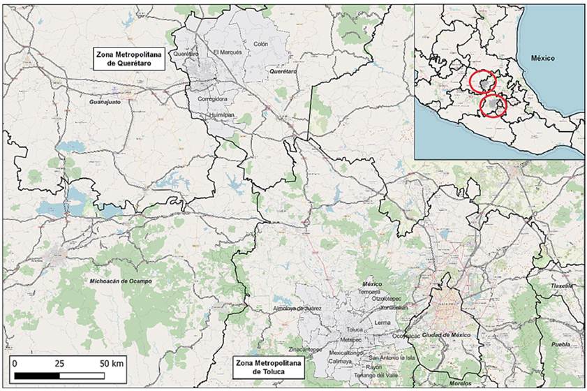 Las zm de Toluca y Querétaro (zmt y zmq, respectivamente) se ubican a 57 y 218 km respectivamente de la Ciudad de México, la primera hacia el oriente y la segunda hacia el nororiente4 (figura 1). El crecimiento urbano e industrial de ambas, parte de la desindustrialización de la Ciudad de México. La congestión urbana y manufacturera en la Ciudad de México, durante la segunda mitad del siglo XX, incentivó el desplazamiento de empresas hacia ciudades adyacentes, como Toluca, Querétaro y Puebla (Rendón Rojas et al., 2019, p. 37). El caso de zmq es más reciente y ha sido más por la planeación industrial del Gobierno que por los procesos del mercado5 (Rendón- Rojas et al., 2019, p. 52). Vilchis et al. (2022) sugieren que zmq funciona como "bisagra" que articula la Ciudad de México con ciudades importantes de la región del Bajío y del norte del país, y, a su vez, con ciudades del sur de Estados Unidos.