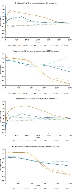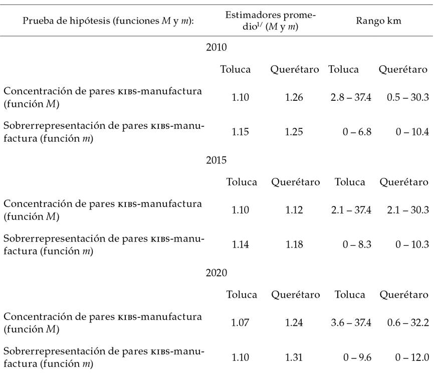 El resultado para la función M (concentración de pares) de la tabla 6 revela que sí existe evidencia de coaglomeración conjunta. Dicho de otra forma, a pesar de que las kibs, como sector, exhiben una estructura u organización espacial intrametropolitana distinta a la de las manufacturas, sí hay casos (ubicaciones) puntuales en los que se observa coaglomeración significativa. Los resultados sugieren que esto ocurre tanto a distancias cortas (menores a 1 km en zmq y alrededor de los 2 km en zmt), como al considerar el agregado metropolitano (más de 30 km en ambas).
