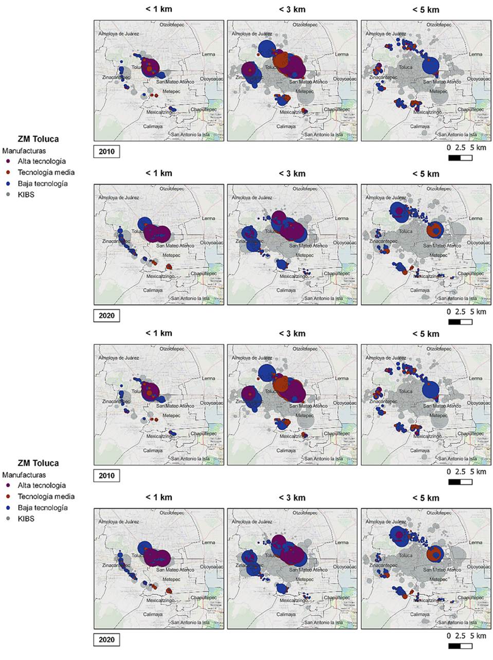 En función del párrafo previo y resultados obtenidos, consideramos que ambas, ZMT y ZMQ, revelan dos procesos urbano-industriales afines, en los que la "ventana de oportunidad" de colaboraciones KiBS-manufactura (Wyrwich, 2019) se encadena a la integración de la economía mexicana a la región de América del Norte. Así, el análisis de este artículo revela -a partir de patrones intrametropolitanos de concentraciones KiBS-manufactura- cómo la posibilidad de colaboraciones o sinergias locales (Lafuente et al., 2019) responde a procesos espaciales-económicos más allá de la escala metropolitana.