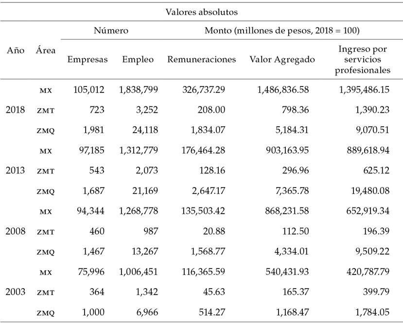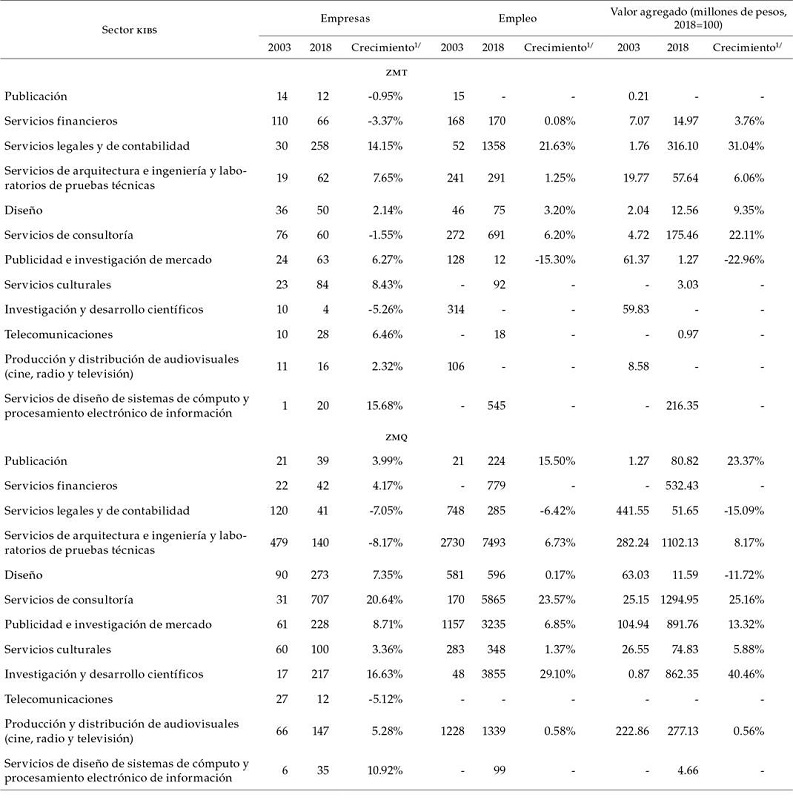 La tabla 1 compara los sectores kibs (número de empresas, empleo, valor agregado y remuneraciones) de zmt y zmq respecto a México (total, mx), de 2003 a 2018. Los datos, como se ha mencionado, provienen de los Censos Económicos de México (inegi, 2023a). El crecimiento porcentual quinquenal anualizado (2003-2008, 2008-2013 y 2013-2018) de empresas kibs ha sido de 4.6% promedio en ambas, zmt y zmq (2.2 % a nivel nacional); y el crecimiento del empleo, de 5.9% (zmt) y 8.3 °% (zmq) en promedio (comparado con el 4.0% nacional). El crecimiento porcentual quinquenal anualizado del valor agregado del sector kibs ha sido, en promedio, de 9.6 °% y 9.0% (zmt y zmq, respectivamente, comparado con el 5.9 %% nacional), con tendencia creciente en el tiempo en zmt y decreciente en zmq. En ambas, zmt y zmq, las tasas de crecimiento quinquenales promedio (2003-2018) por remuneraciones e ingresos por servicios son mayores a la media nacional.