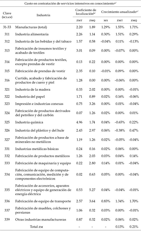 La tabla 3 muestra los coeficientes de localización y tasas de crecimiento del gasto de la manufactura (y totales) en la contratación de servicios kibs para el período 2008-2018. Los coeficientes de localización resultan de la razón de dos porcentajes (Isserman, 1977), en los que el divisor representa el porcentaje de gasto en estos servicios, a escala nacional (México: mx), y los dividendos el porcentaje de gasto en zmt y zmq. Estos coeficientes revelan la concentración del gasto manufacturero en servicios kibs en ambas ciudades: la proporción de gasto es mayor en zmt, aunque zmq revela tasas de crecimiento altas que sugieren un incremento paulatino en el gasto manufacturero en servicios kibs.