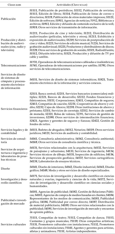En relación con las tres clasificaciones provistas, definimos a las kibs como empresas especializadas cuya experiencia y conocimiento adquirido las posiciona como agentes clave en la diseminación del conocimiento en contextos urbano-regionales. Partiendo de esta definición, utilizamos la clasificación de kibs propuesta para México por Álvarez-Lobato et al. (2023) (ver tabla 4 en Metodología), que afina la clasificación perfilada en Romero de Ávila (2019), por dos razones principales: i. Esta refleja las categorías del Sistema de Clasificación Industrial de América del Norte, scian (Instituto Nacional de Estadística y Geografía [inegi], 2018a), que permite estimar resultados por clases kibs en función de los códigos estándar de clasificación; y, ii. La desagregación de las clases kibs a partir de los códigos del scian permite analizar los resultados en función de los tipos de clasificación descritos en este apartado: formas de innovación, base de conocimiento y demanda de sus servicios.