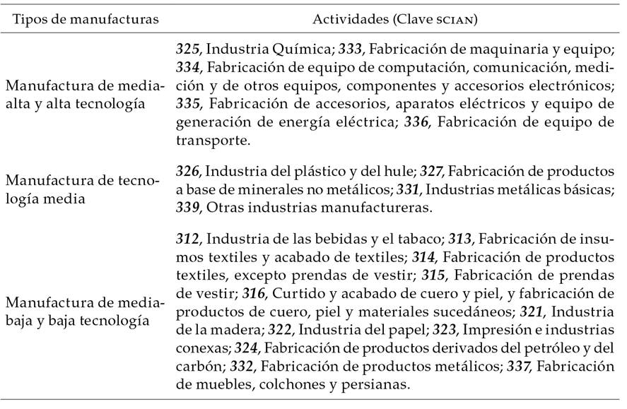 En este apartado se presenta el marco metodológico del estudio, que se apoya en los hallazgos del apartado previo. La discusión sigue tres ejes: i. La definición de las clases de kibs, para lo que se retoman los argumentos presentados en el apartado teórico; ii. La delimitación de los tipos de manufactura; y iii. La definición de los indicadores que utilizamos, así como sus formulaciones matemáticas, considerando los datos del Directorio Estadístico Nacional de Unidades Económicas, denüe, para 2010, 2015 y 2020 (inegi, 2010, 2015, 2022). Estos datos están georreferenciados por cada empresa y permiten observar la rama de actividad económica de cada una de ellas, así como su tamaño según el número de empleados.7