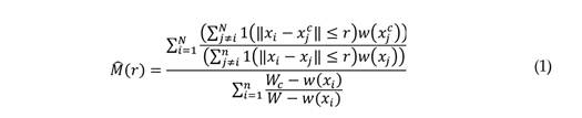 La ecuación (1) presenta la fórmula a partir de la cual estimamos la intensidad de concentración. La función M estima indicadores acumulados por radios de distancia a partir de cada punto georreferenciado que, en este caso, representa cada empresa manufacturera (Marcon & Puech, 2010). El radio más amplio de estimación para cada empresa representa la distancia entre esa empresa y la empresa más alejada, lo que hace a los estimadores