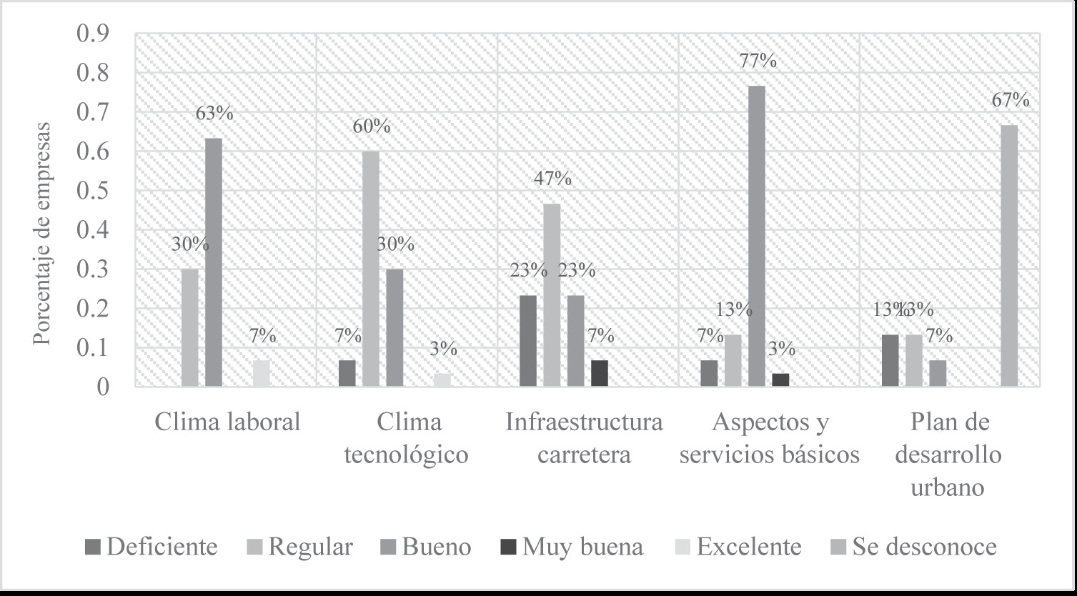 El entorno territorial de Ciudad Hidalgo, Michoacán, persigue el equilibrio entre los aspectos de clima laboral y tecnológico, de infraestructura carretera y de servicios básicos plasmados en el Plan de Desarrollo Urbano. Por ello, la evolución de estos aspectos se valora con base en la opinión de las empresas del mueble encuestadas (grafica 1).