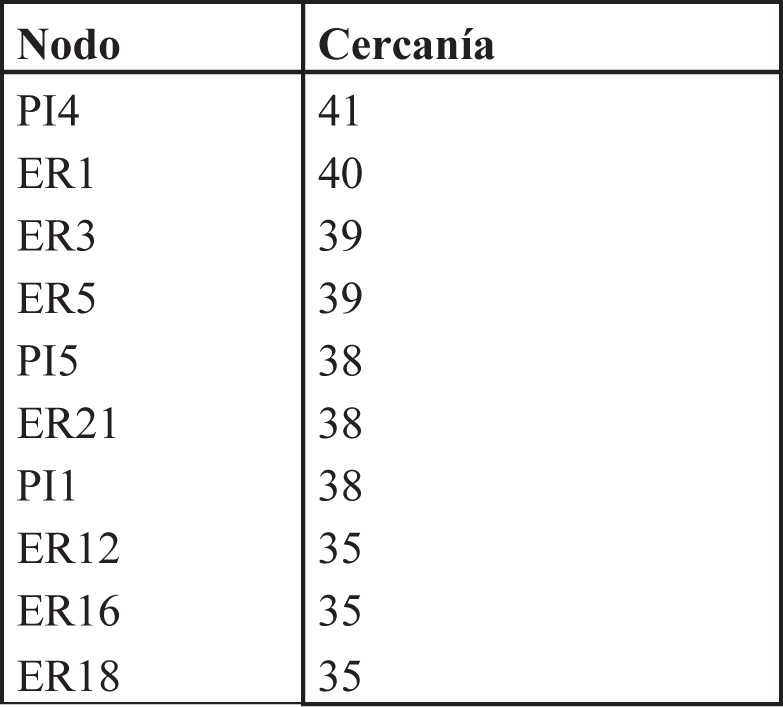 Este indicador se refiere al grado de acceso que tiene un actor con el resto de los integrantes en la red, no necesariamente son aspectos geográficos los que determinan este grado, son aspectos socialmente construidos relacionados con el grado de cohesión. En la tabla 3 se muestran únicamente los actores con mayor grado de cercanía.