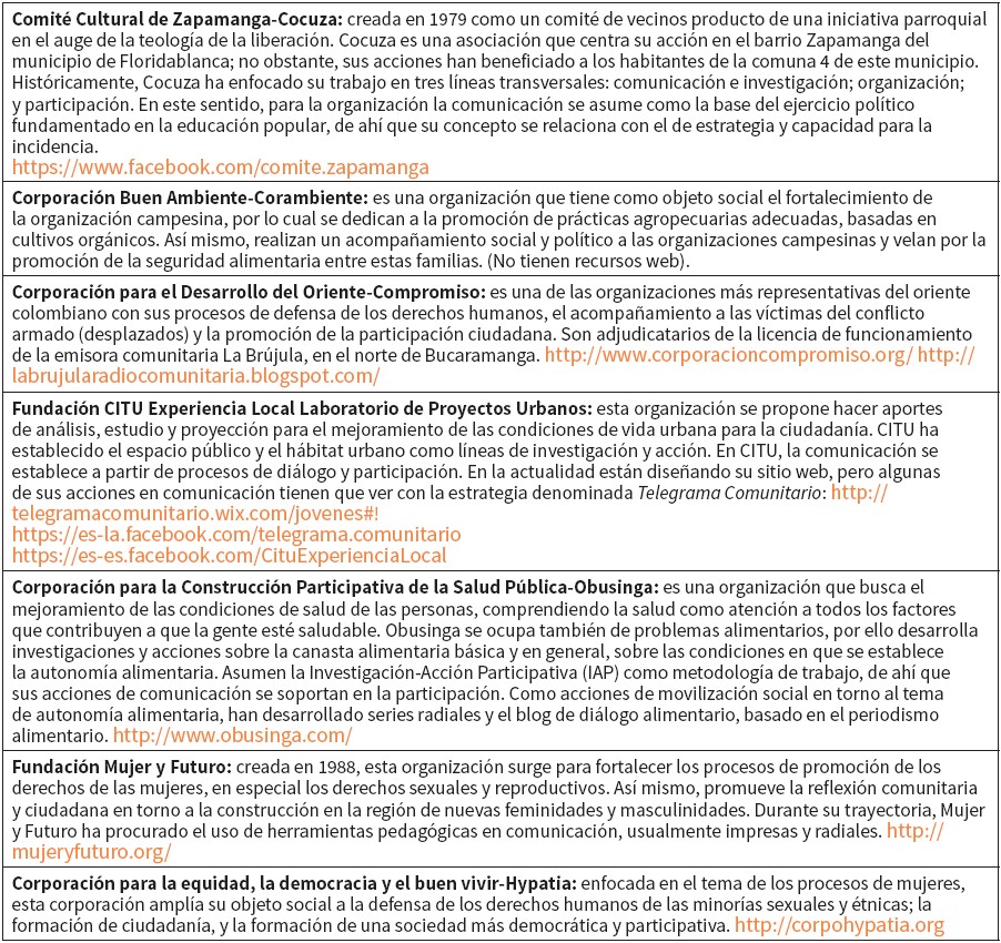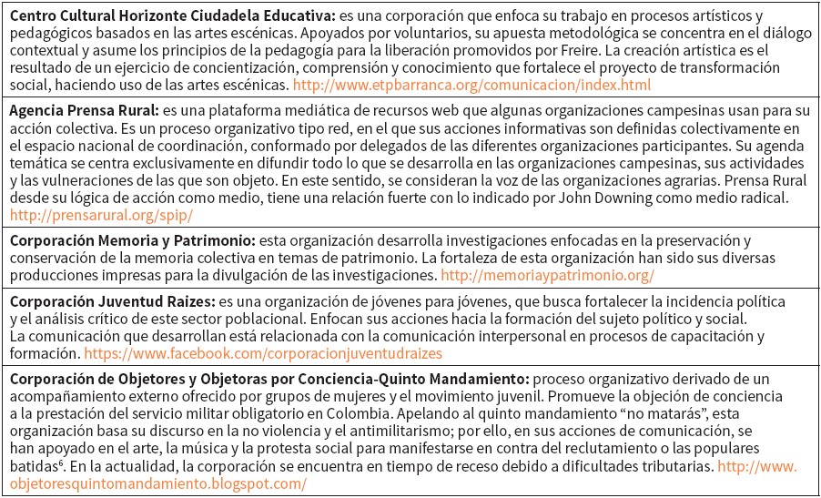 Cada organización seleccionada responde a un objeto social, metodologías y públicos diversos. En algunas, sus campos de acción se hacen comunes a otras; no obstante, para no errar en una clasificación estandarizada, a continuación se expone un cuadro de presentación con los datos característicos de cada organización, al tiempo que se abordan algunos elementos generales del proceso de comunicación que desarrollan.