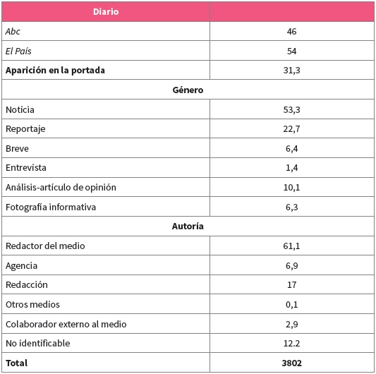 Como unidad de análisis se consideró cada texto (noticia, reportaje, breve, entrevista, artículo de opinión y fotografía informativa) publicado en la sección: Nacional/España/Política de cada diario, para un total de 3802 unidades (incluidos los textos de opinión, que fueron descartados del análisis de contenido). De acuerdo a los objetivos del trabajo quedaron excluidos de la codificación tanto los textos de opinión (incluidas las viñetas) como las fotografías informativas. Se excluyeron también las informaciones referentes a procesos electorales, puesto que los objetivos del trabajo se centran en la información política en periodos de actividad política rutinaria. Para Walgrave y van Aelst (2006) los actores políticos y los periodistas siguen una lógica distinta en periodo electoral a la que siguen en periodo de política ordinaria: a) cambia el comportamiento de los actores políticos, que intentan llamar más la atención de los medios; b) los medios tienen más problemas para establecer su propia agenda de temas, y c) los medios en periodo electoral se rigen por unas reglas que promueven la equidad y el juego limpio. En total se analizaron 3174 textos de los dos diarios. La obtención de los datos fue realizada por dos codificadores, que fueron previamente entrenados en los criterios de codificación. Para determinar la fiabilidad del proceso, de manera aleatoria, se codificó doblemente el 10 % de las unidades de análisis. El cálculo de la pi de Scott fijó un valor medio de acuerdo entre codificadores del 0,8. En la tabla 1 se encuentran los datos de identificación básicos de la muestra.