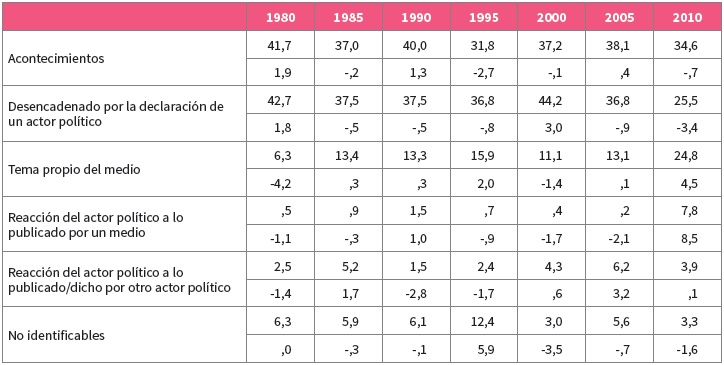 Cuando se ha considerado si estas tendencias son similares en los dos diarios, los resultados han revelado que en el primer año del análisis (1980) no existían diferencias estadísticamente significativas entre Abc y El País, pero a partir de 1985 sí se dan. Más exactamente, el análisis de los residuos tipificados corregidos indica que las diferencias se concentran en las categorías: noticias desencadenadas por acontecimientos y declaraciones de los actores políticos. Así en el diario El País hay una presencia mayor de las noticias desencadenadas por acontecimientos (55,7 % en 1990, 50,4 % en 1995, 52 % en 2000, 66,4 % en 2005 y 42,1 % en 2010), mientras que en Abc son mayores los porcentajes de las declaraciones de los actores políticos en los años analizados (48,5 % en 1990, 41,4 % en 1995, 55,7 % en 2000, 45,4 % en 2005 y 43,1 % en 2010).