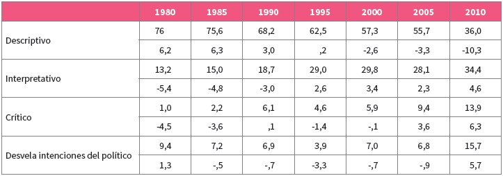 Los residuos tipificados corregidos de la tabla 3 nos muestran que la tendencia hacia un periodismo más interpretativo comienza a cambiar a partir de la segunda mitad de los años 90. Si comparamos el estilo descriptivo con el interpretativo, el cambio se manifiesta en los datos para la información analizada en los años 1995 y 2000, coincidiendo con el momento señalado por algunos autores como la culminación de las relaciones de cooperación entre medios y políticos que había caracterizado al periodo de la Transición. Se corrobora también el argumento de la comercialización expuesto por McNair (2000) que afirmaba que la competencia entre medios y la comercialización tenía como consecuencia recurrir al estilo interpretativo como estrategia comercial. En este sentido, hay que señalar que la televisión comercial privada en España comienza sus emisiones en 1990, y que por lo tanto, es lógico que sus efectos sobre la prensa escrita se hagan notar precisamente en los años señalados. De hecho, los datos que poseemos sobre el uso de los estilos descriptivo e interpretativo en la información televisiva en España nos indican que el 36,9 % de las noticias recurren a la interpretación, subiendo el porcentaje hasta más del 40 % en las cadenas de televisión privadas (Humanes et al., 2013).