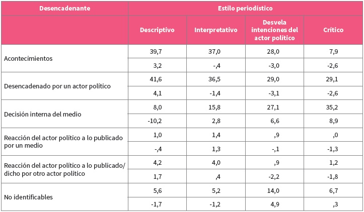 Por último, en la cuarta hipótesis se planteó que el desencadenante de la información está relacionado con el estilo periodístico, de tal forma que cuando el desencadenante es el propio diario el estilo periodístico será menos descriptivo y más orientado a los otros tres estilos. Los resultados indican que no se han producido cambios durante el periodo de tiempo considerado en la relación entre tipos de desencadenantes y estilos periodísticos, por lo que se trabajará con los datos globales de la muestra. Como se observa en la tabla 4 (con los datos de toda la muestra), el análisis de residuos tipificados corregidos corrobora la hipótesis e indica dos tendencias importantes. Primero, una sobrerrepresentación del estilo descriptivo cuando los desencadenantes son acontecimientos o declaraciones de un actor político. Segundo, la fuerte presencia de los estilos más alejados de la descripción cuando es el medio de comunicación el que toma la iniciativa en la publicación. Los dos diarios muestran la misma tendencia.