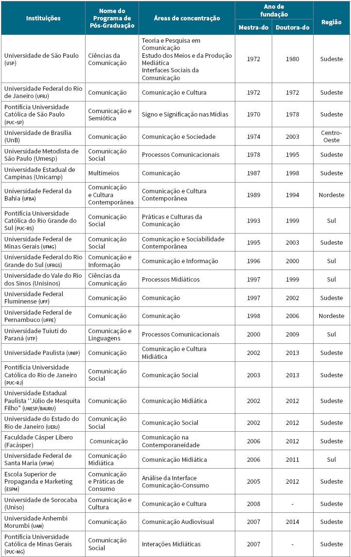 Os primeiros cursos de pós-graduação stricto sensu em Comunicação no País foram os da Escola de Comunicações e Artes da Universidade de São Paulo (ECA-USP), da Escola de Comunicação da Universidade Federal do Rio de Janeiro (ECO-UFRJ), da Pontifícia Universidade Católica de São Paulo (PUC-SP), da Universidade de Brasília (UnB) e da Universidade Metodista de São Paulo (Umesp)8. Esses cursos lideraram os estudos de pós-graduação em Comunicação no Brasil até, praticamente, o início dos anos 1990, incluindo-se na década de 1980 o Programa de Multimeios, da Universidade Estadual de Campinas (Unicamp), e o de Comunicação e Cultura Contemporânea, da Universidade Federal da Bahia (UFBA).