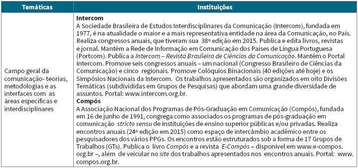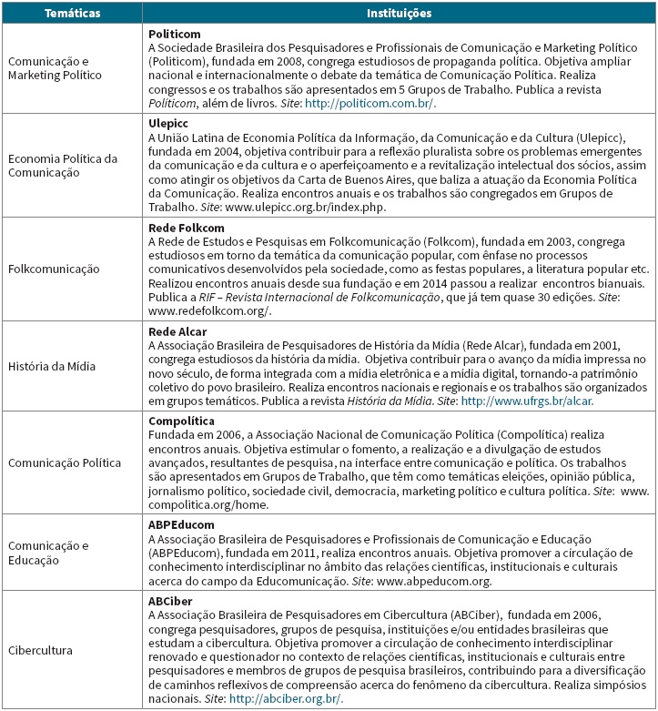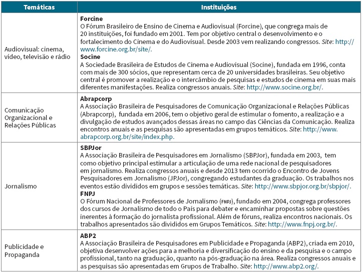 Para entender a vocação, a finalidade e as contribuições de todas as associações, existentes classificamo-las em três categorias: 1. Associações científicas interdisciplinares – quadro 2: Sociedade Brasileira de Estudos Interdisciplinares da Comunicação (Intercom) e Associação Nacional dos Programas de Pós-Graduação em Comunicação (Compós); 2. Associações acadêmicas que congregam subáreas da Comunicação e especialidades profissionais, integradas pelas seguintes entidades – Quadro 3: Associação Brasileira de Pesquisadores de Comunicação Organizacional e Relações Públicas (Abrapcorp); Fórum Nacional de Professores de Jornalismo (FNPJ); Associação Brasileira de Pesquisadores em Jornalismo (sbpjor); Sociedade Brasileira de Estudos de Cinema e Audiovisual (Socine); Fórum Brasileiro de Ensino de Cinema e Audiovisual (Forcine); e Associação Brasileira de Pesquisadores em Publicidade (abp2). 3. Associações acadêmicas de áreas específicas e multidisciplinares do campo das Ciências da Comunicação, que congregam estas entidades – Quadro 4: Associação Brasileira de Pesquisadores em Cibercultura (ABCiber); Associação Brasileira de Pesquisadores de História da Mídia (Rede Alcar); Rede de Estudo e Pesquisa em Folkcomunicação (Folkcom); União Latinoamericana de Economia Política da Informação, da Comunicação e da Cultura, Capítulo Brasil (Ulepicc); Associação Nacional de Comunicação Política (Compolítica); Sociedade Brasileira de Pesquisadores e Profissionais de Comunicação e Marketing Político (Politicom); e Associação Brasileira de Pesquisadores e Profissionais de Comunicação e Educação (ABPEducom).