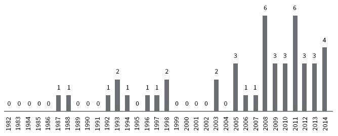 A partir de esta revisión, se tiene el primer resultado de esta investigación: entre los años 1982 —fecha de la creación del fondo— y 2014 se aprobaron un total de 45 proyectos en el área de Ciencias de la Comunicación e Información. El primero de ellos se adjudicó recién el año 1987 —5 años después de la primera versión del concurso— correspondiendo al estudio “La televisión en Chile”, a cargo de la investigadora María de la Luz Hurtado, del Centro de Comunicación y Cultura para el Desarrollo3.