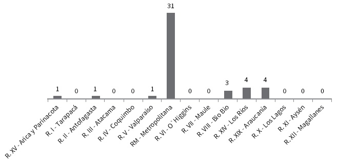 En lo que se ha denominado como distribución institucional, ya se evidencia una concentración geográfica en la zona metropolitana capital de Chile, lo que no es sino un reflejo del fuerte centralismo que caracteriza a Chile, y que es una queja constante en otras dimensiones de la vida social, económica y política. “Santiago es Chile”, versa un dicho popular que, de acuerdo con los datos, se ve reflejado también en los espacios académicos desde donde se genera conocimiento en el área.