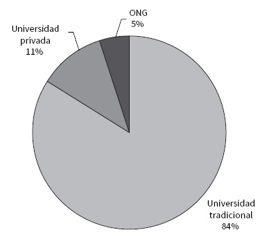 Esta concentración la vemos también en dos variables: una general —tipo de universidades— y otra específica —institución que ostenta el mayor número de proyectos—. En la primera de ellas, la arista general, se observa un marcado e inapelable predominio de las universidades tradicionales, por sobre las privadas.