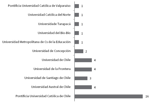 En cuanto a las universidades que llevan a cabo los proyectos adjudicados por Fondecyt Regular, hay una doble concentración. Por una parte, se ve que es solo una la institución la que encabeza la mayor cantidad de investigaciones, la Pontificia Universidad Católica de Chile, la misma que cuenta con la revista del área con mejor indexación y el programa de doctorado con más trayectoria en el país (y, de hecho, único hasta 2015). Estos datos son parecen interesantes de relacionar pues, se habla de una comunidad académica que ha proyectado el desarrollo de la disciplina considerando sus distintas variables: formación de pre- y posgrado, desarrollo de nuevo conocimiento y, además, difusión de este.