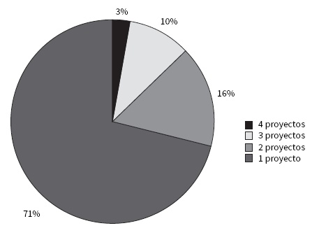 El único criterio que rompe la tendencia de concentración corresponde a los investigadores responsables de los proyectos: los 45 proyectos de la muestra se distribuyen en 31 investigadores principales. De estos, la gran mayoría (22 investigadores, es decir el 70,9 % del total) figura en las bases de datos como responsable de solo un proyecto.