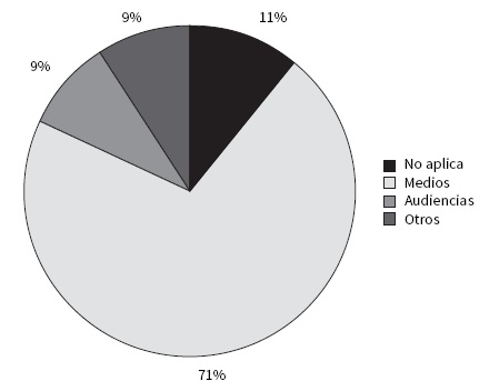 El segundo soporte de estudio prioritario —aunque de manera muy marginal— corresponde a las audiencias (no mediadas por los medios) con cuatro proyectos (9 % de la muestra): 2 centrados en la recepción de la divulgación de la ciencia y 2 en el consumo cultural de los museos. El resto de los estudios —que están categorizados como “otros”— considera soportes de investigación heterogéneos, y observados solo en un proyecto como el propio campo profesional del periodismo en Chile, publicidad, formación inicial docente de maestros en el área de lenguaje desde la perspectiva de la edu-comunicación y modelos institucionales de comunicación municipal (institución de gobierno local equivalente a los ayuntamientos españoles) en zona urbanas pobres.