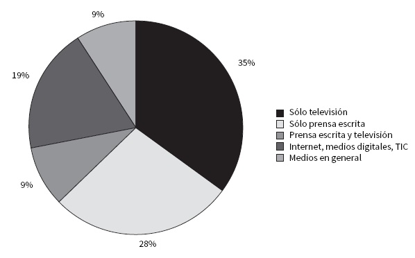 Entre los 32 proyectos vinculados con los medios, la atención principal, como objeto de estudio, se centra en la televisión. En total, 14 investigaciones la consideran como soporte de estudio; 11 (38 %) de manera exclusiva, y 3 (10 %) en conjunto y comparación con la prensa escrita.