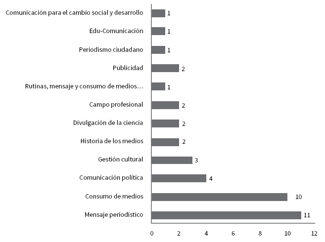 Más allá de los soportes en que se centra la recolección de datos de las diferentes investigaciones, las temáticas se distribuyen entre los proyectos de la muestra, en 12 temas de estudio diferentes, siendo el predominante el que se ha denominado como mensaje periodístico.