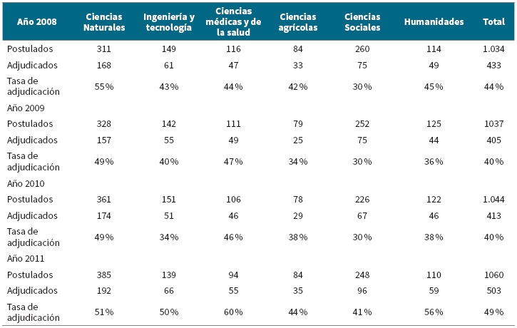 A pesar de eso, sí se pueden aportar algunos elementos de contexto, y es que la tasa de adjudicación de los proyectos presentados en el área de Ciencias Sociales, donde se ubica Comunicación e Información, es —al menos entre los años 2008 y 2011— la más baja en relación con el resto de áreas disciplinarias. Este dato, no permite establecer conclusiones definitivas, pero aporta perspectiva para comprender el lugar de la disciplina en el contexto general del apoyo público al desarrollo científico en el país.