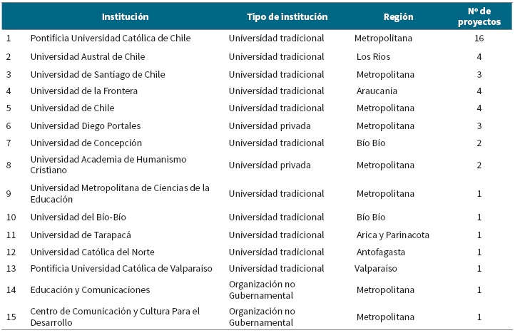 Tomando esta caracterización como marco, se observa que el lugar protagónico en la adjudicación de proyectos de Fondecyt se concentra en las universidades tradicionales pertenecientes al CRUCH, con una cifra de proyectos adjudicados (38) muy superior a la de las universidades privadas (5), y a la de organizaciones no gubernamentales (2). Estas últimas, además, se adjudicaron proyectos muy al inicio del periodo observado —María de la Luz Hurtado, del Centro de Comunicación y Cultura para el Desarrollo (1987), con el proyecto “La televisión en Chile”; y Fernando Ossandón Correa, de Educación y Comunicaciones (ECO) (1993), con el estudio “Hacia un modelo de comunicación municipal participativa, viable y eficiente. Investigación aplicada y experimental en comunas urbanas pobres”—, tendencia que, como se revisó en la caracterización histórica de la investigación en Comunicación en el país, coincide con la llegada de la transición a la democracia, y el declive —en pos de las universidades y el aparato público— de las ONG como espacios de generación de conocimiento.