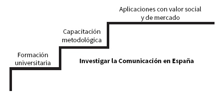 Sin embargo, en este artículo, se van a desentrañar algunas claves que explican el estado de la investigación de la comunicación en España, al poner en cuestión esta pretendida armonía de los componentes que la sustentan. Es decir, siguiendo la figura 1, que simula una escalera construida con solidez y coherencia (cuyos escalones abarcan desde los aspectos más básicos de la formación hasta el empleo profesional de técnicas y conocimientos en proyectos con valor social y de mercado), se planteará qué desajustes podrían dificultar el ascenso por esos escalones de la investigación de la Comunicación.