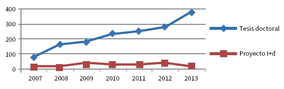 En este último estudio se constata que la investigación universitaria en Comunicación ha experimentado un crecimiento en los últimos años. Ahora bien, como puede apreciarse en la tabla 9 y en la figura 9, este aumento progresivo se produce más en el caso de las tesis doctorales que en los Proyectos del Plan Estatal de Investigación científica y técnica y de innovación, puesto que estos últimos han sufrido un severo decremento a partir de 2013, como consecuencia de los recortes presupuestarios.