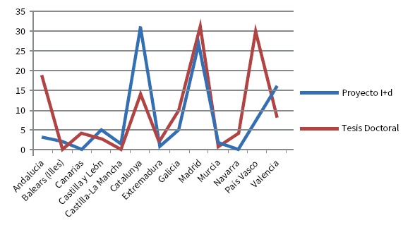 En la tabla 11 y en la figura 10 se observa que la financiación de proyectos I+D en relación con la producción de investigaciones de tesis ofrece valores de distribución desigual, es decir, no estando balanceada según comunidades autónomas. Así, cabe observar cómo algunas comunidades se ven perjudicadas y otras beneficiadas por esta ratio. La desproporción más evidente, si se tienen en cuenta el número de proyectos que reciben financiación por el Plan Estatal de Investigación científica y técnica y de innovación, aparece con la Comunidad de Catalunya, que es beneficiada más que cualquier otra por estas concesiones, aunque seguida de cerca por la Comunidad Valenciana, siendo el País Vasco y las Baleares los siguientes. Al otro extremo, cabe encontrar a la comunidad más perjudicada en Andalucía, cuya desproporción de producción de tesis y de número de asignaciones de financiación es inversamente proporcional a la obtenida por Catalunya. Entre las comunidades que también son agraviadas se encuentran Madrid (-4 puntos) y Galicia (-5 puntos), ambas distanciadas de la media de esta distribución (+8), el fiel de esta balanza entre las magnitudes comparadas, fiel al que se aproxima más la Comunidad del País Vasco (+3).