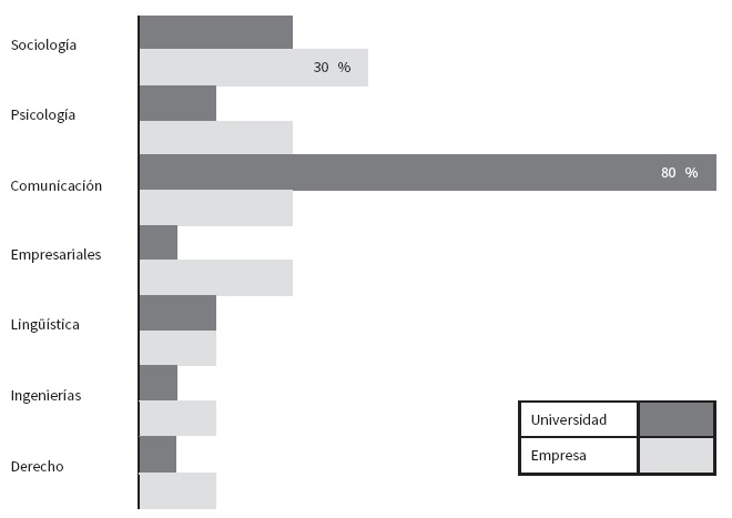 En la figura 3 puede comprobarse la diversa formación de los investigadores de la comunicación en la universidad y en la empresa. La investigación social y de mercado en comunicación se realiza aún con predominancia de profesionales cuya formación es sociológica (30 % aprox.), antes que de otras disciplinas (estudios en comunicación, psicología, empresariales y otros). En cambio, la investigación que se realiza en el marco universitario sobre comunicación está provista de forma casi única (80 % aprox.) por egresados de las facultades de ciencias de la información y de la comunicación, siendo irrelevantes el resto de procedencias.