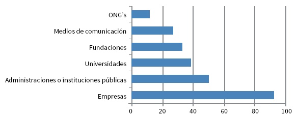 De los investigadores que reconocen que su consultora, agencia o gabinete está especializada en investigación o análisis de la comunicación, la gran mayoría (94,4 %) puntualiza que sus principales clientes son las empresas. De los investigadores que reconocen que su consultora, agencia o gabinete tiene una actividad más amplia y además desarrolla estudios de comunicación, la mayoría de ellos (83,3 %) también reconoce que sus principales clientes son las empresas. ¿Qué sucede con las administraciones o instituciones públicas y la especialización de las empresas? Pues bien, los investigadores que reconocen que su organización está especializada en investigación o análisis de la comunicación, menos de la mitad (38,9 %), puntualizan que también tienen como clientes a las administraciones o instituciones públicas. No sucede lo mismo con los investigadores que indican que su organización tiene una actividad más amplia y además desarrolla estudios de comunicación, pues poco más de la mitad de los encuestados (51,4 %) reconoce que también tiene como clientes a las administraciones o instituciones públicas. En la figura 6 el lector también podrá constatar el tipo de instituciones que comprenden los principales clientes de las agencias consultoras y los gabinetes de investigación de las empresas españolas consultadas. Por orden de aparición son las siguientes: Universidades (38,4 %), Fundaciones (32,6 %), Medios de comunicación (26,9 %) y ONG (11,5 %).