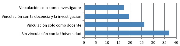 En cuanto a la relación profesional de los investigadores con la universidad se puede decir que de los encuestados que responden a esta pregunta 1 de cada 3 (36,9 %) no mantiene vinculaciones con la universidad, en tanto que el resto, es decir, 2 de cada 3 (63,1 %) mantienen algún tipo de relación con la universidad como docente o investigador.