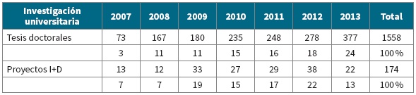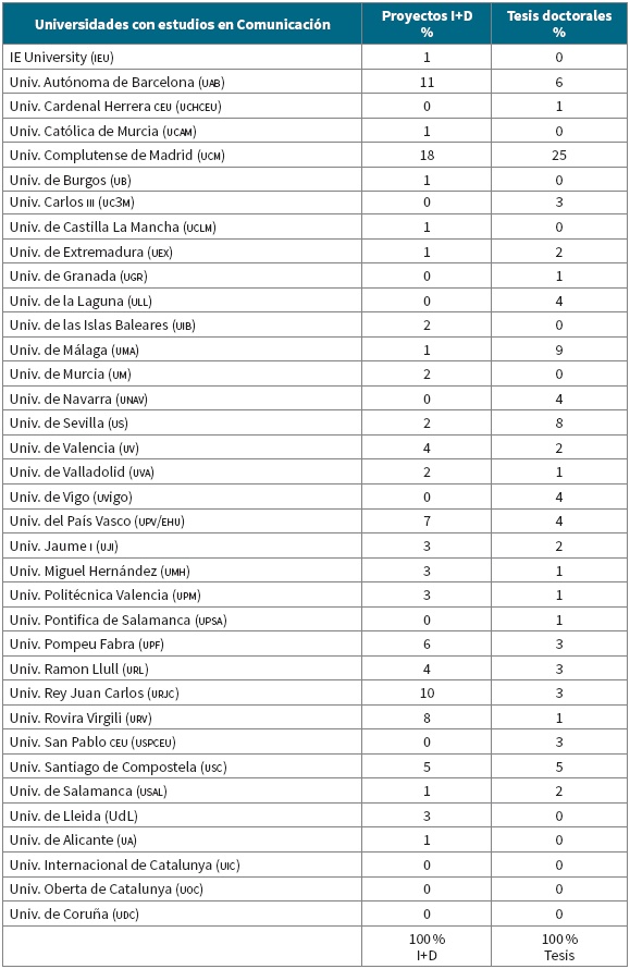 La tabla 10 ofrece un panorama en el que destaca a la Universidad Complutense de Madrid de forma diferencial, con la mayor producción en España en número de tesis (25 % del total de tesis doctorales) y de proyectos financiados (18 % del total de I+D). Seguida de la Universidad de Málaga (9 %), la Universidad de Sevilla (8 %) y la Universidad Autónoma de Barcelona (6 %), en cuanto a las tesis leídas. Mientras que, en relación con los proyectos financiados, la que presenta mejor cómputo en términos absolutos, tras Madrid, es la Universidad Autónoma de Barcelona (11 % del total de proyectos).