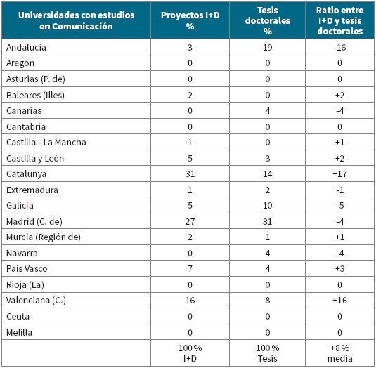 Sin duda, el número de tesis leídas y el de investigaciones financiadas en una universidad y en el conjunto de universidades de cada comunidad autónoma son indicadores relevantes de la producción investigadora, y lo son por su utilidad para elaborar el mapa de la investigación sobre comunicación en España.