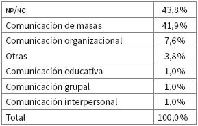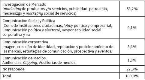 Hay que añadir que de los encuestados que no tienen ninguna vinculación con la universidad, 1 de cada 3 (35,3 %) trabaja en organizaciones especializadas en la investigación o análisis de la comunicación, mientras que 2 de cada 3 (64,7 %) trabaja en organizaciones que tienen una actividad más amplia y además desarrolla estudios de comunicación. Este dato demuestra la desafección existente entre la actividad investigadora que se realiza en la universidad y en las empresas especializadas en la investigación en comunicación.