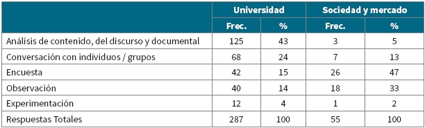 En conjunto, predomina el uso de las técnicas de investigación mixtas, que articulan técnicas cuantitativas y cualitativas, para analizar los distintos objetos de estudio comunicacionales. Ahora bien, si hubiera que destacar las técnicas más empleadas, en la universidad se imponen las de índole cualitativa del tipo de las técnicas de análisis del discurso y, en cambio, en la investigación social y de mercado prevalecen las cuantitativas de la mano de la técnica de encuesta. Esto es un dato relativo al análisis del discurso no al análisis de contenido, que es la técnica cuantitativa más frecuentada por los docentes investigadores de la academia. Por lo tanto, solo en la comparación con la investigación realizada fuera de la universidad, tiene sentido el anterior aserto6.