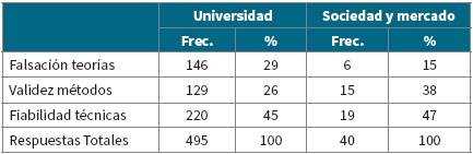 A diferencia de lo que suele ocurrir con la investigación que se desarrolla en el ámbito universitario (en la que los controles metodológicos son prescriptivos: ser o no ser de su carácter científico), la investigación social y de mercado presenta para los mismos autores de este sector una evaluación dispar en la que las teorías se falsan algunas veces o nunca el 43 % de las veces, aproximadamente, los métodos no se validan o solo se validan algunas veces en torno al 30 % y las técnicas ofrecen dudas, en el sentido de que no se someten a controles de fiabilidad o solo lo hacen en ciertos casos en un 20 %. Por decirlo de otro modo, las garantías que ofrece la práctica investigadora para los mismos investigadores que realizan los estudios sociales y de mercado en este campo resulta ser bastante limitada: solo se somete a los controles de calidad elevados o muy elevados el 45 % del total de los trabajos. Esta autoevaluación tan crítica que realizan los investigadores no universitarios sobre las garantías metodológicas de su investigación comunicacional se une a la percepción de sus carencias principales que, como aquí se ha indicado, se relacionan con su apreciación acerca de la necesidad de investigadores provenientes del ámbito universitario que cuenten con una buena formación metodológica y técnica, caracterizada por su capacidad analítica y la actualización de conocimientos.